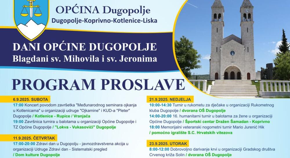 U tjednu uoči obilježavanja dana Općine Dugopolje, na programu su vjerska, zabavna i sportska događanja.