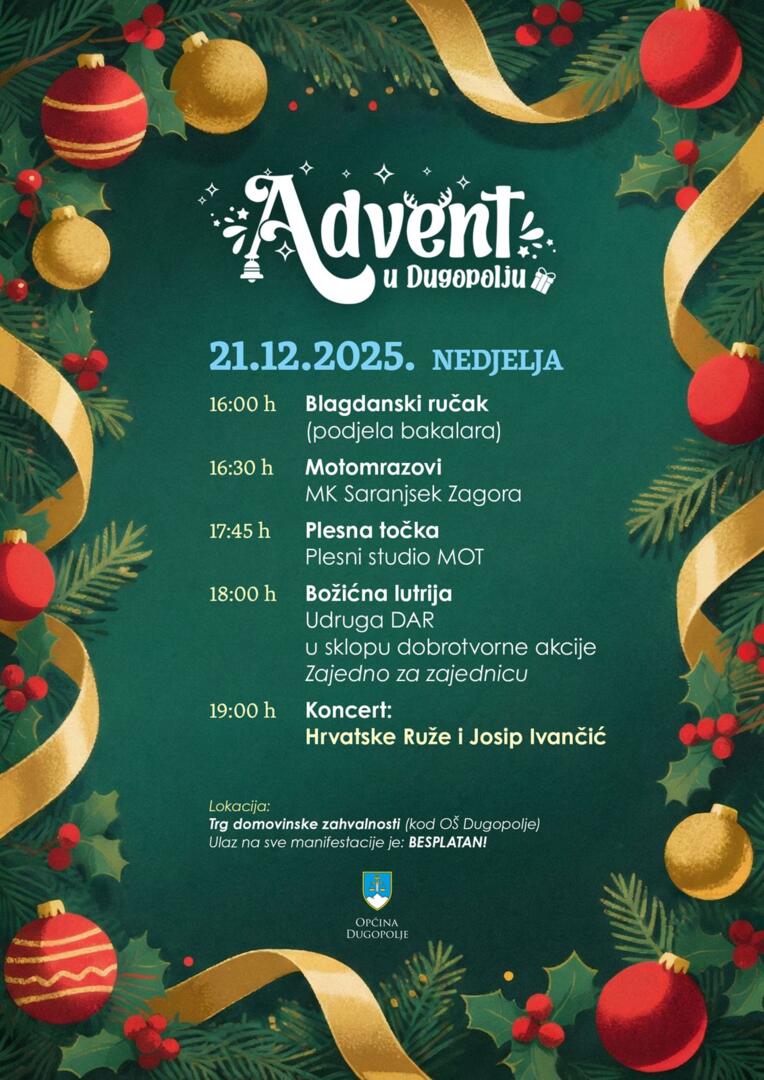 Sutradan, u nedjelju 21. prosinca, nastavlja se adventsko druženje u Dugopolju na Trgu domovinske zahvalnosti (preko puta OŠ Dugopolje). U popodnevnim satima sprema se tradicionalni blagdanski ručak od 16:00 h. Nakon ručka slijedi prava poslastica za mališane – Motomrazovi MK Saranjsek Zagora razveselit će djecu prigodnim poklonima izvodeći svoje moto akrobacije. Na pozornici će Plesni studio Mot izvesti plesnu točku u 17:45 h, nakon koje slijedi božićna lutrija u organizaciji udruge DAR Dugopolje.